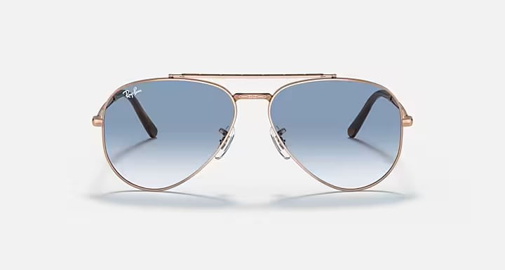Design Sofisticado: O acabamento em ouro rosado e a ponte dupla dão ao New Aviator um visual elegante e moderno. Os detalhes de gravuras premium na armação elevam o design.