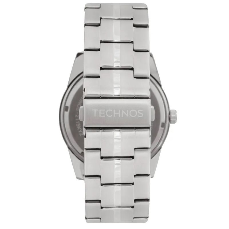 Relógio Technos masculino com caixa e pulseira de aço. Este modelo possui características esportivas. Com banho prata, o aro proeminente e o vinco nos elos centrais da pulseira são atributos fortes. O mostrador preto traz calendário e indexes em camadas tridimensionais. Modelo resistente a água até 50 metros.