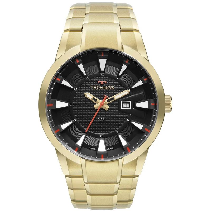 Relógio Technos Masculino com caixa e pulseira de aço dourado. Seu mostrador preto com textura dá destaque aos marcadores brancos inspirados em referências automobilísticas. Possui calendário e resistente à água 50 metros.