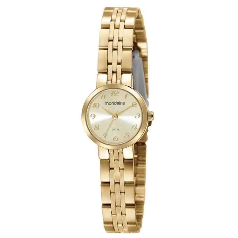 Este modelo da Mondaine se destaca pela caixa e pulseira em metal na cor Dourado polido. O mostrador em tom Champagne (Dourado Claro) harmoniza perfeitamente com a pulseira de elos finos, criando um visual que remete a uma joia de pulso. Os números e índices em relevo facilitam a leitura e conferem um acabamento premium.