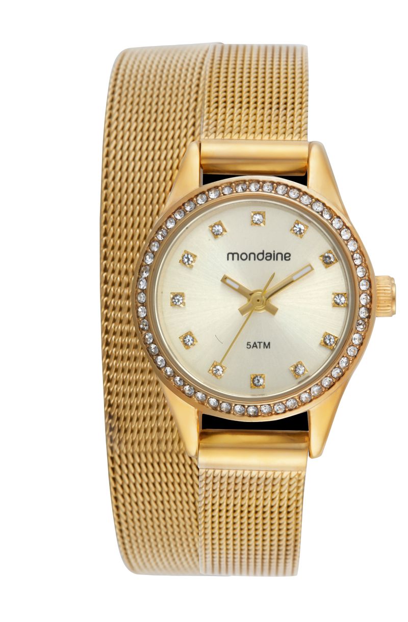 Invista em um acessório que une as tendências de moda e o charme clássico: o Relógio Feminino Mondaine Dourado Pulseira Mesh (Ref. 32827). Sua pulseira estilo esteira oferece um caimento impecável e sofisticado, enquanto o mostrador é adornado com um aro cravejado de strass, garantindo um brilho sutil e elegante em seu pulso. É o relógio perfeito para quem busca um toque de glamour moderno.