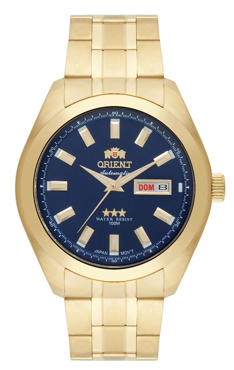 O mostrador azul profundo com marcadores geométricos dourados garante excelente legibilidade e elegância. Equipado com movimento automático, dispensa bateria, funcionando pelo movimento natural do pulso. O modelo também conta com calendário duplo (dia da semana e data), reforçando sua praticidade.