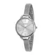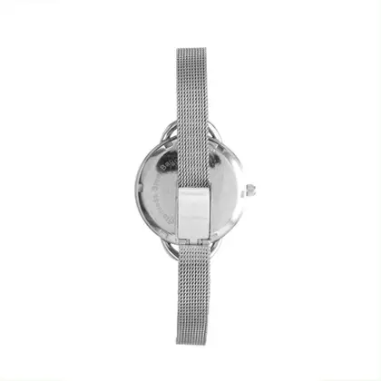 Super delicado, este relógio expõe a elegância do visual monocromático. É coberto por uma folheação prata, possui pulseira bem fina em malha de aço e visor com marcadores minimalistas.