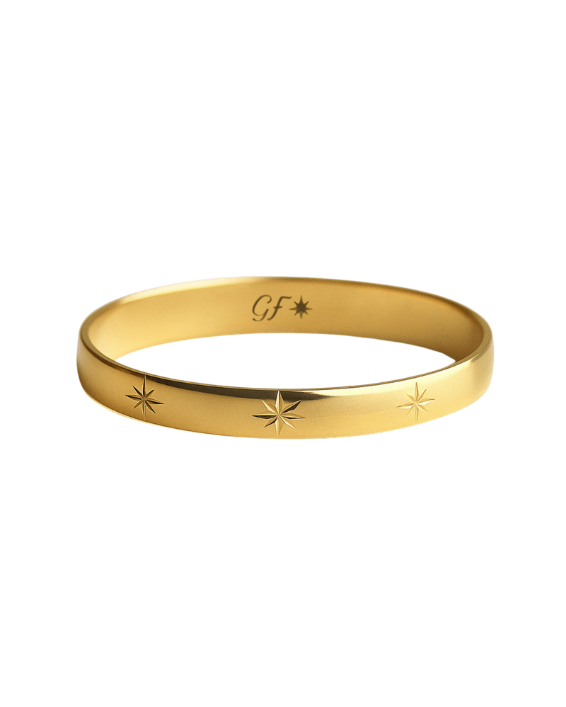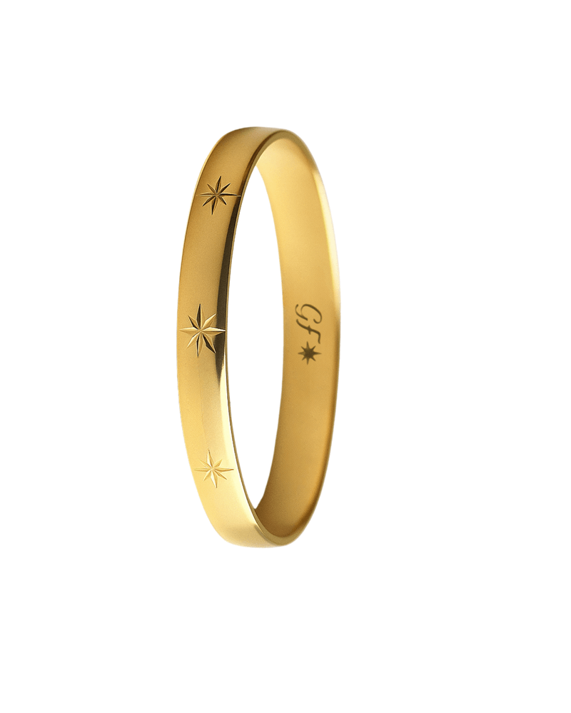 A aliança Goldfinger GF03-2.5T07 é a personificação da delicadeza e do romantismo. Seu acabamento externo é elegantemente trabalhado com a gravação sutil de estrelas polidas sobre uma superfície fosca. Este detalhe minimalista, mas significativo, evoca a luz guia do amor, simbolizando o destino e a conexão profunda entre o casal, fugindo do tradicional com um toque poético e celestial.