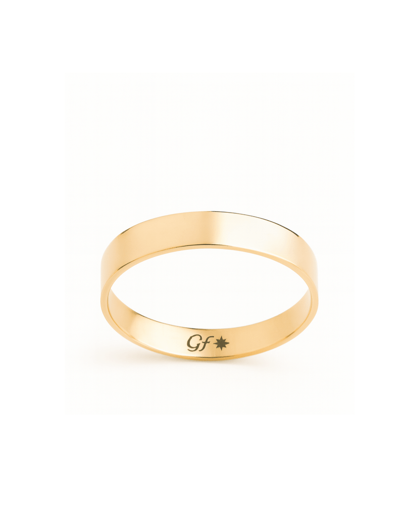 Destaque: Com uma largura de 4mm, esta aliança oferece um visual imponente e moderno. O acabamento reto ressalta a qualidade do ouro, garantindo uma peça que não passa despercebida e oferece máxima durabilidade. O acabamento interno reto proporciona um contato total com o dedo com ajuste sólido, garantindo a sensação tradicional e segura de uma aliança clássica, um símbolo de união com forte impacto visual.