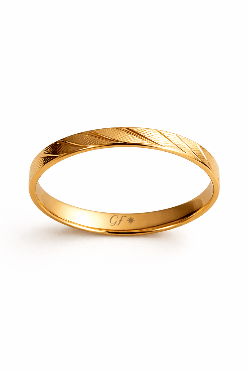 A aliança Goldfinger GF04-2.7ANT11 é a perfeita fusão de delicadeza e design arrojado. Seu acabamento externo é elegantemente trabalhado, apresentando um padrão em relevo que se assemelha a uma espinha de peixe ou ao movimento de folhas, com linhas em ziguezague que alternam entre o brilho polido e o fosco sutil. Este detalhe moderno e dinâmico confere profundidade à peça, garantindo um visual sofisticado que foge do comum.