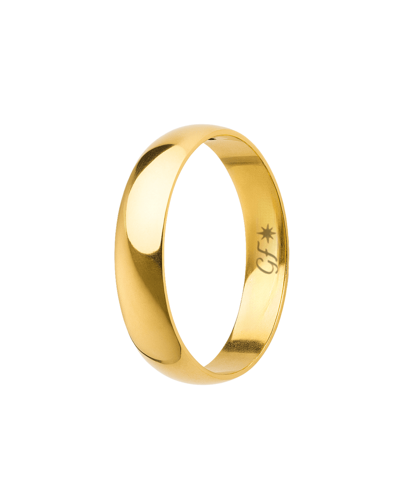 Destaque: A largura de 5mm garante o destaque, enquanto o acabamento interno reto confere a segurança e o encaixe tradicional. Uma peça clássica para quem busca imponência com sobriedade. O acabamento interno reto proporciona um contato total com o dedo com ajuste sólido, garantindo a sensação tradicional e segura de uma aliança clássica, um símbolo de união com forte impacto visual.