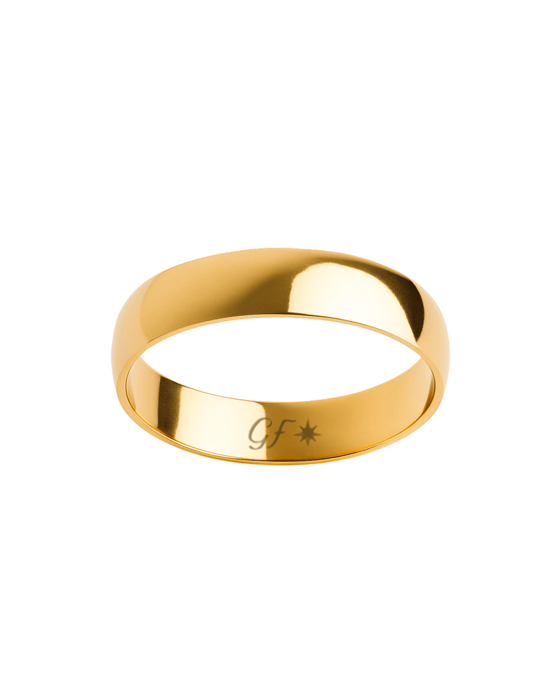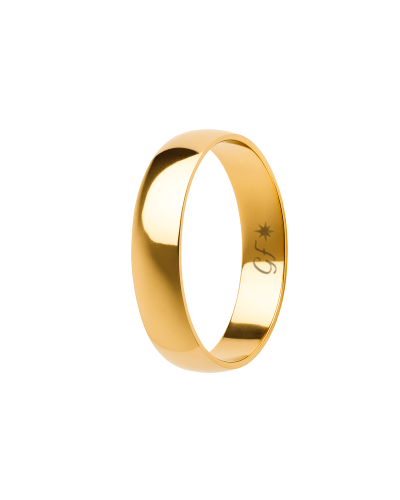 Destaque: Esta aliança de 5mm com acabamento interno reto possui uma excelente visibilidade e peso. É um modelo clássico, robusto e atemporal, feito para durar e simbolizar um grande compromisso. O acabamento interno reto proporciona um contato total com o dedo com ajuste sólido, garantindo a sensação tradicional e segura de uma aliança clássica, um símbolo de união com forte impacto visual.