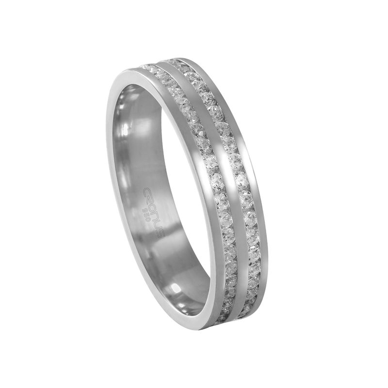 Destaque: Esta peça impressiona pelo design simétrico e luxuoso, apresentando duas fileiras paralelas de zircônias cuidadosamente cravejadas que percorrem toda a sua extensão. Entre o brilho das pedras, destaca-se uma faixa central elevada com acabamento polido espelhado, criando um contraste de texturas e reflexos que valoriza a prata 950. Possui um formato reto e imponente, ideal para quem busca uma joia com presença marcante e um acabamento de alta joalheria.