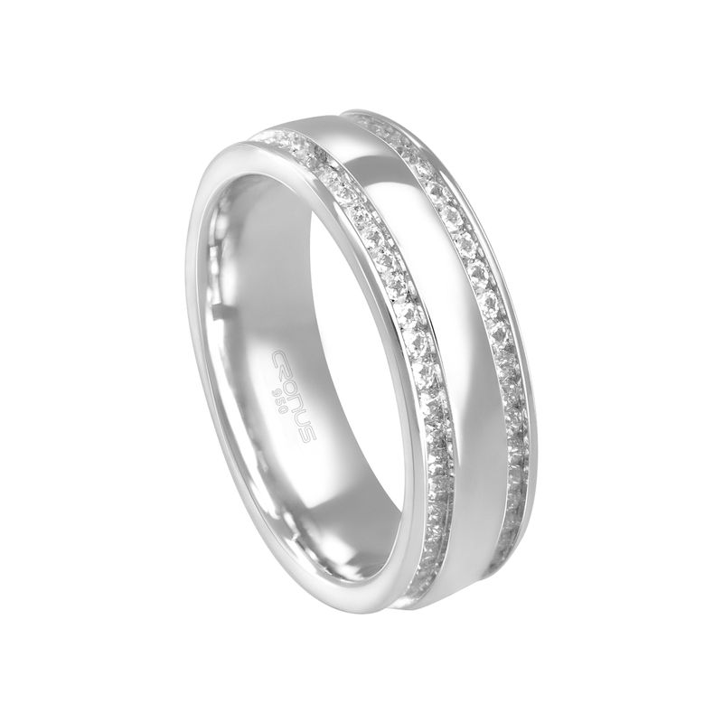 Destaque: O grande diferencial são as duas fileiras laterais repletas de pedras (zircônias), que conferem um brilho luxuoso e contínuo à peça. A faixa central é lisa e com acabamento espelhado, criando um contraste elegante com o brilho das pedras laterais. Possui um formato levemente abaulado e robusto, ideal para quem busca uma aliança que marque presença sem perder a delicadeza.
