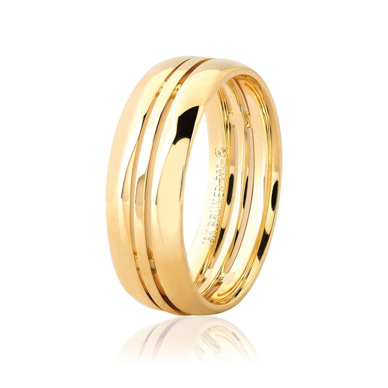 Destaque: Esta aliança apresenta um design robusto e imponente, caracterizado por sua largura generosa de 7mm e perfil triplo. A peça é composta por três faixas abauladas paralelas, separadas por delicados frisos em baixo-relevo, o que confere um visual de três alianças unidas em uma só joia. Todo o conjunto possui acabamento polido de alto brilho em ouro amarelo 18k. Seu formato interno anatômico garante um conforto excepcional, essencial para uma peça desta largura, permitindo um ajuste suave e ergonômico ao dedo.