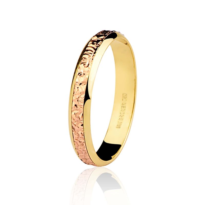 Destaque: Esta aliança celebra as Bodas de Ouro com uma estética rica em texturas e contrastes. O design apresenta uma faixa central trabalhada com acabamento diamantado profundo, criando uma superfície irregular que reflete a luz de forma intensa e orgânica. Essa textura vibrante é emoldurada por bordas polidas em alto relevo, que conferem estrutura e sofisticação à peça. O perfil reto mantém a joia alinhada às tendências contemporâneas, destacando a elegância do ouro amarelo 18k.