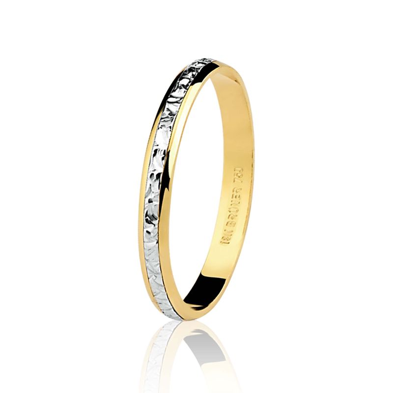 Destaque: Esta aliança celebra as Bodas de Prata com um design delicado e repleto de brilho. A peça apresenta uma faixa central em ouro branco com acabamento diamantado trabalhado, que cria uma textura orgânica e radiante, emoldurada por bordas finas em ouro amarelo polido. O perfil reto e a largura de 2,5mm conferem uma estética minimalista e elegante, destacando o contraste sofisticado entre as duas cores de ouro 18k.