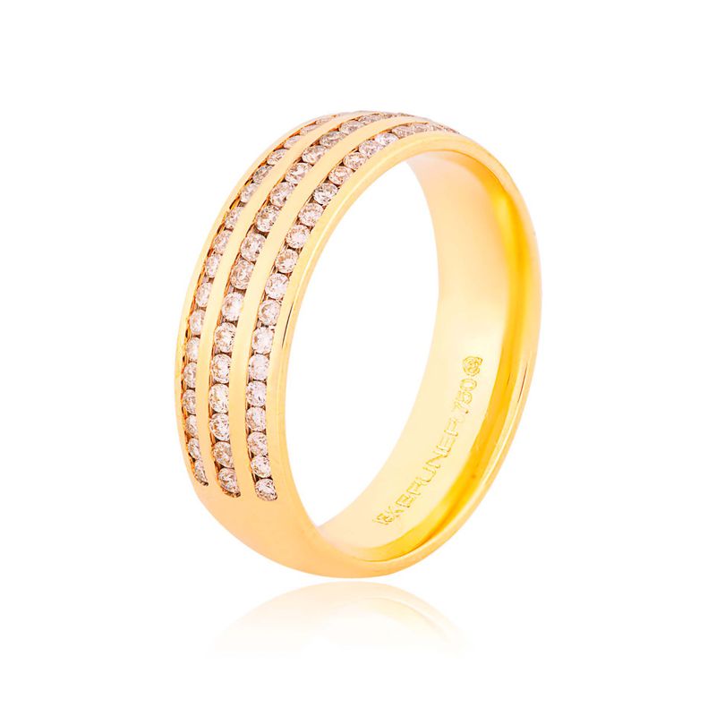 Esta aliança apresenta um design luxuoso e imponente, caracterizado por um perfil largo de 5mm em ouro amarelo 18k com acabamento polido de alto brilho. O grande diferencial desta joia é a sua cravação tripla em estilo "half eternity", composta por 70 pedras de diamante (brilhantes) que somam 48 pontos. As pedras são meticulosamente organizadas em três fileiras paralelas que ocupam a parte superior da peça, separadas por delicados frisos de ouro que realçam a luminosidade de cada gema. Seu formato interno anatômico garante um conforto superior, proporcionando um ajuste suave e perfeito, ideal para o uso contínuo de uma peça com essa presença.