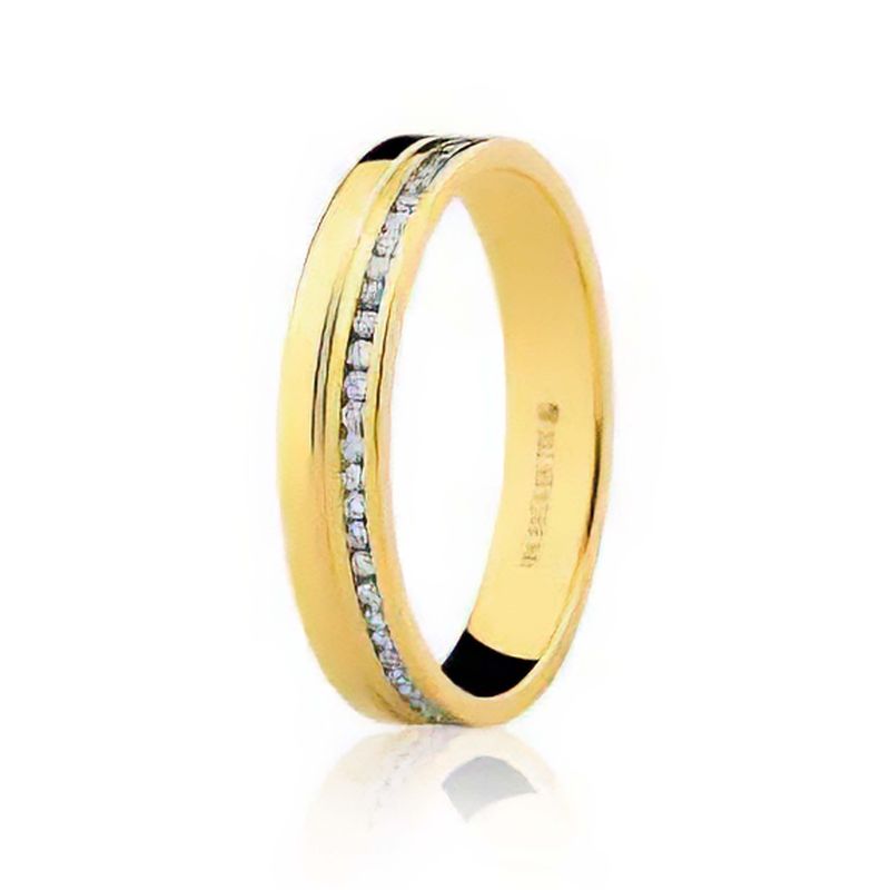 Esta aliança apresenta um design elegante e de brilho intenso, caracterizado por um perfil levemente abaulado em ouro amarelo 18k com acabamento polido. O grande diferencial desta joia de 4mm é a sua face central meticulosamente cravejada com 57 pedras de diamante (brilhantes) que somam 28 pontos. As pedras estão organizadas em uma trilha contínua que percorre toda a circunferência da peça, criando um efeito de luz sofisticado e ininterrupto. Seu formato interno anatômico garante um conforto superior, proporcionando um ajuste suave e perfeito ao dedo para o uso diário.