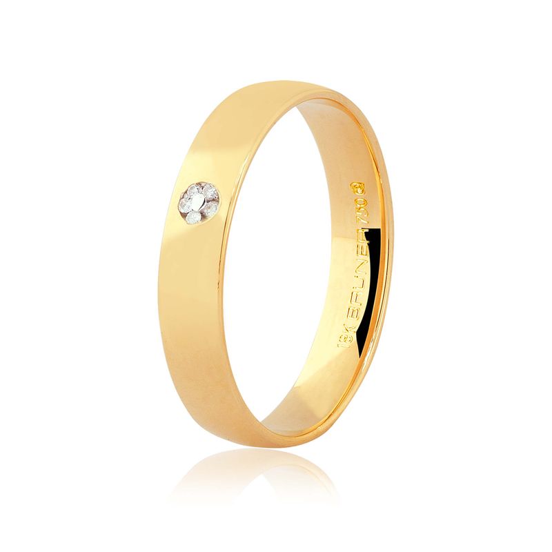 Esta aliança apresenta um design clássico e delicado, caracterizado por um perfil de 4mm em ouro amarelo 18k com acabamento polido de alto brilho. O grande diferencial desta joia é o seu detalhe central em formato floral, composto por 5 pedras de diamante (brilhantes) que somam 2 pontos. As pedras são meticulosamente cravadas em um pequeno círculo de ouro branco, criando um contraste suave e um ponto focal romântico sobre o aro dourado. Seu formato interno anatômico garante um conforto superior, proporcionando um ajuste suave e perfeito ao dedo para o uso diário.