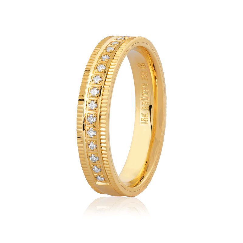 Esta aliança apresenta um design clássico com um toque de textura moderna, caracterizado por um perfil de 4mm em ouro amarelo 18k. O grande diferencial desta joia é a sua trilha central delicadamente cravejada com 15 pedras de diamante (brilhantes), que somam 13 pontos, garantindo brilho e exclusividade únicos.