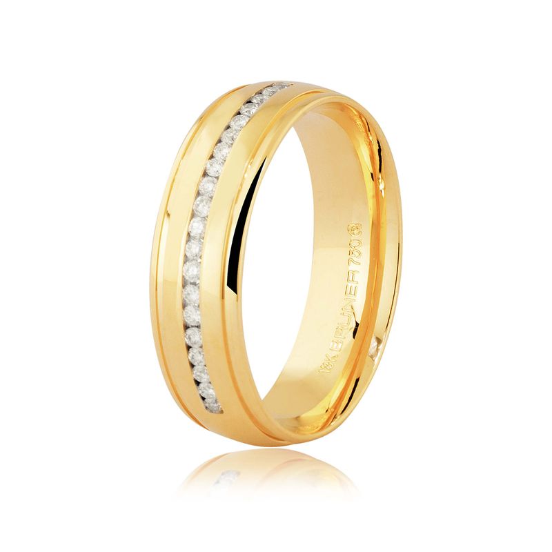 Esta aliança apresenta um design robusto e elegante, caracterizado por um perfil largo de 6mm em ouro amarelo 18k com acabamento polido de alto brilho. A joia possui um canal central delicadamente rebaixado, onde estão cravadas 20 pedras de diamante (brilhantes) que somam 18 pontos. As pedras percorrem parte da circunferência da peça, criando uma trilha de luz sofisticada emoldurada por bordas de ouro polido. Seu formato interno anatômico garante um conforto superior, proporcionando um ajuste suave e perfeito ao dedo para o uso diário.