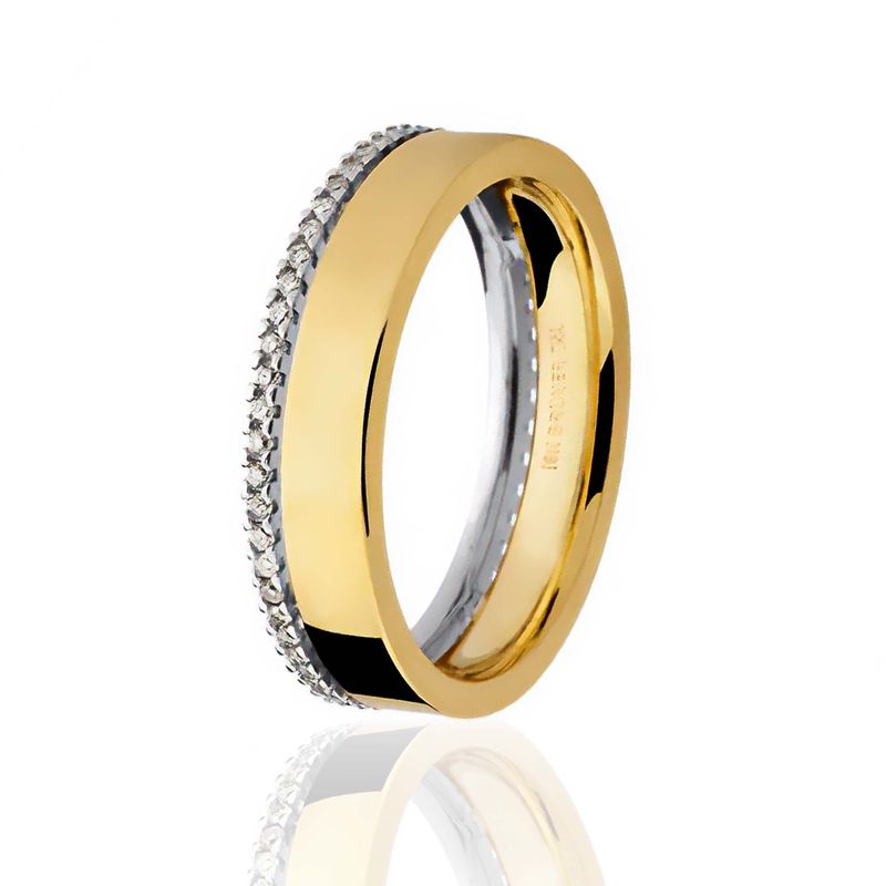 Perfeita para quem busca uma joia de 5mm com design arquitetônico e sofisticado, unindo o contraste dos tons de ouro à intensidade de uma cravação lateral completa.