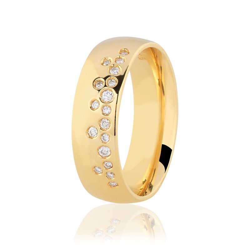 Esta aliança apresenta um design contemporâneo e artístico, caracterizado por um perfil largo de 6mm em ouro amarelo 18k com acabamento polido de alto brilho. O grande diferencial desta joia é a sua cravação orgânica e assimétrica, composta por 17 pedras de diamante (brilhantes) que somam 13 pontos. As gemas, de tamanhos variados, são delicadamente espalhadas pela face da aliança em um arranjo que remete à fluidez e à exclusividade, fugindo dos padrões tradicionais de cravação em linha. Seu formato interno anatômico garante um conforto superior, proporcionando um ajuste perfeito ao dedo.
