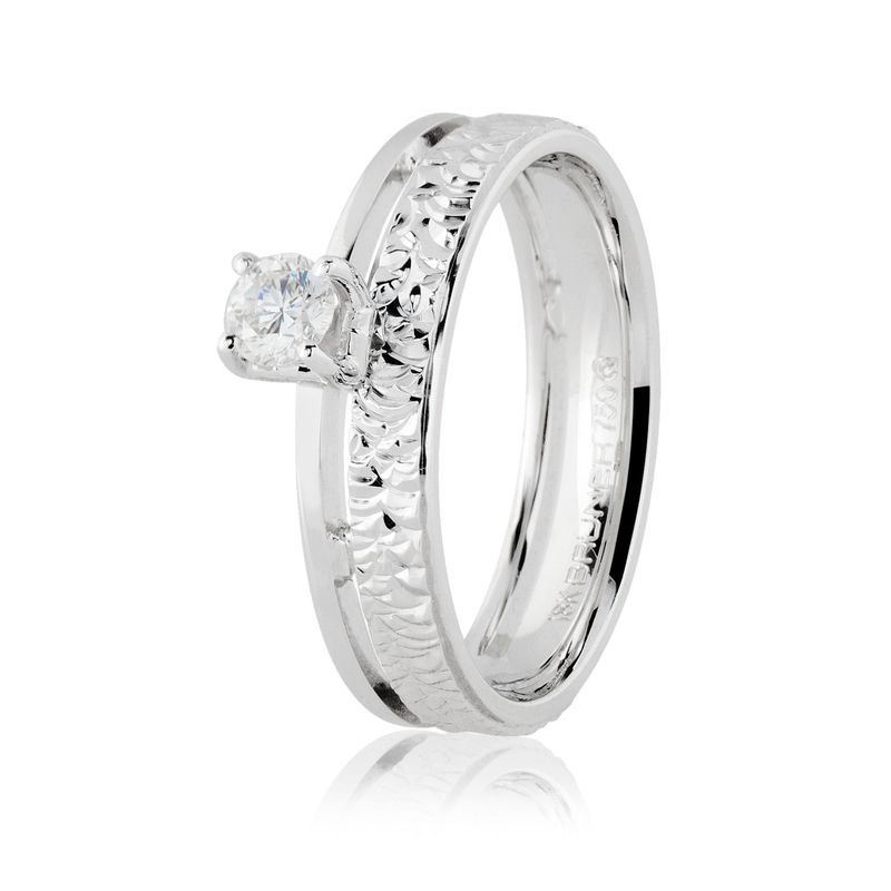 Esta aliança apresenta um design exclusivo e romântico, caracterizado por um perfil de 4,5mm em ouro branco 18k com uma rica textura diamantada. A joia é composta por dois aros paralelos: um aro liso e polido que serve de base para a cravação, e um aro principal com acabamento diamantado que exibe um padrão esculpido para refletir a luz de forma multifacetada. O grande diferencial desta peça é a sua pedra central de diamante (brilhante) de 20 pontos, cravada em destaque em um suporte de quatro garras, unindo o conceito de uma aliança ao clássico anel solitário. Seu formato interno anatômico garante um conforto superior, proporcionando um ajuste suave e perfeito ao dedo para o uso diário.