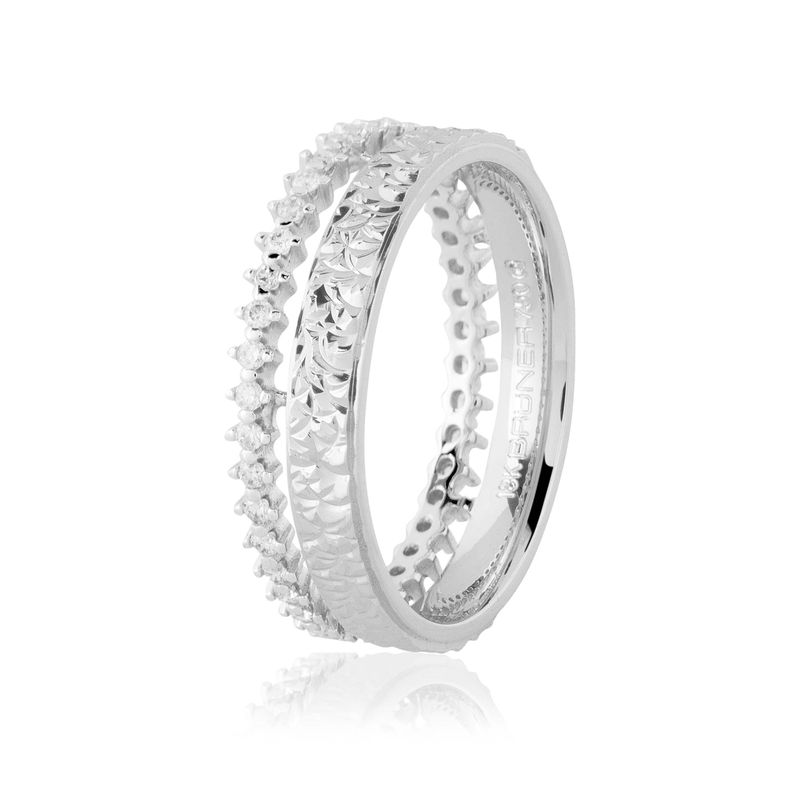 Esta aliança apresenta um design artístico e texturizado, caracterizado por um perfil de 5,5mm em ouro branco 18k com acabamento diamantado, que exibe um padrão de gravação em relevo para um brilho multifacetado. O grande diferencial desta joia é o seu aro secundário delicadamente cravejado com 38 pedras de diamante (brilhantes) que somam 26 pontos. As pedras são organizadas em garras individuais ao longo de toda a circunferência, criando uma coroa de luz que acompanha o aro principal. Seu formato interno anatômico garante um conforto superior, proporcionando um ajuste suave e perfeito ao dedo para o uso diário.