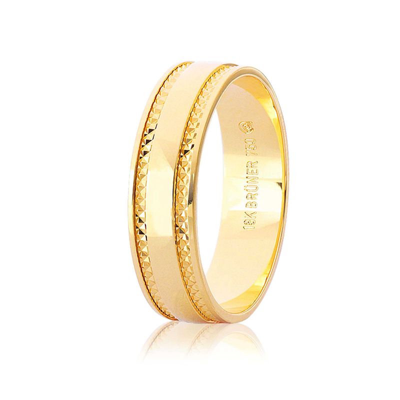 Destaque: Esta aliança apresenta um design elaborado e luxuoso, caracterizado por uma ampla faixa central polida de alto brilho em ouro amarelo 18k. O diferencial desta joia de 5,5mm está em suas bordas laterais, que possuem um acabamento diamantado em padrão de micro-pirâmides. Este trabalho artístico cria uma moldura geométrica que reflete a luz de forma intensa, proporcionando um contraste marcante com a superfície lisa central. Seu formato interno anatômico garante um conforto superior e um ajuste suave ao dedo, ideal para o uso contínuo.
