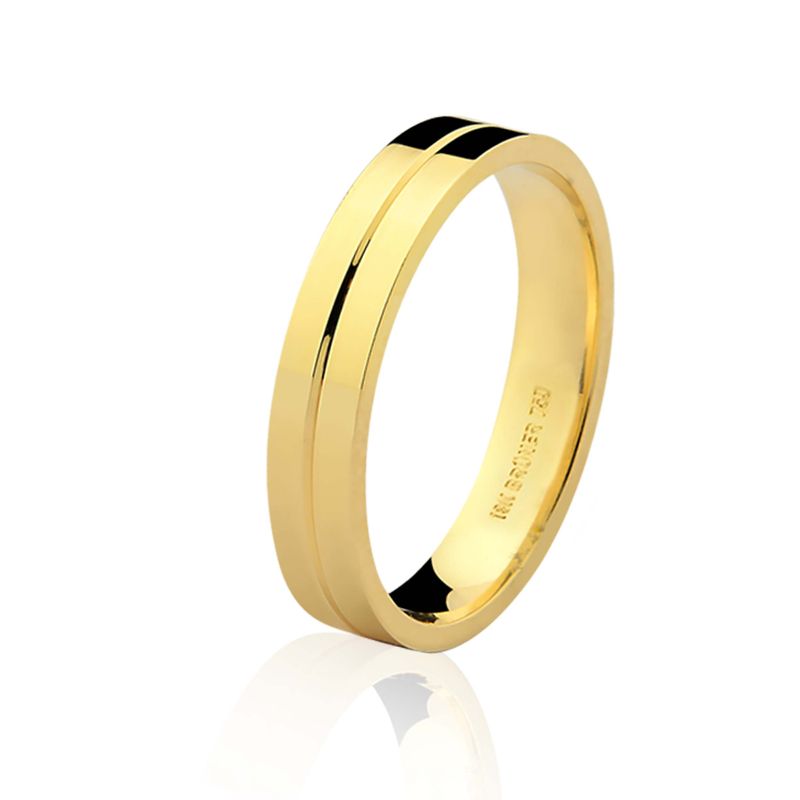 Destaque: Esta aliança apresenta um design moderno e minimalista, caracterizada por seu perfil reto e acabamento polido de alto brilho em ouro amarelo 18k. O diferencial desta peça é o delicado friso central em baixo-relevo que percorre toda a sua circunferência, adicionando um detalhe geométrico discreto e elegante à joia. Seu formato interno anatômico garante um conforto excepcional para uso contínuo, permitindo que a aliança se ajuste perfeitamente ao dedo com suavidade.