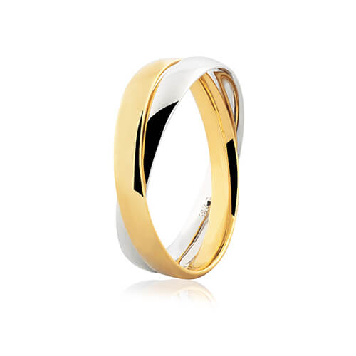 Destaque: Esta aliança apresenta um design icônico e simbólico, caracterizado pelo estilo de elos entrelaçados. A joia é composta por dois aros de perfil abaulado que se cruzam de forma harmoniosa: um aro em ouro amarelo polido e outro em ouro branco polido. Com uma largura delicada de 3mm, a peça oferece um visual clássico e fluido que representa a união inseparável. O seu formato interno anatômico garante um conforto superior e um ajuste suave ao dedo para o uso cotidiano.