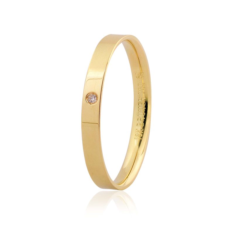 Esta aliança apresenta um design minimalista e delicado, caracterizado por um perfil fino de 2,5mm em ouro amarelo 18k com acabamento polido de alto brilho. O grande diferencial desta joia é a sua elegância discreta, destacada por 1 pedra de diamante (brilhante) de 0.9 ponto cravada de forma centralizada no aro. A pedra é inserida diretamente no metal, mantendo a superfície lisa e destacando o brilho pontual do diamante. Seu formato interno anatômico garante um conforto superior, proporcionando um ajuste suave e perfeito ao dedo para o uso diário.