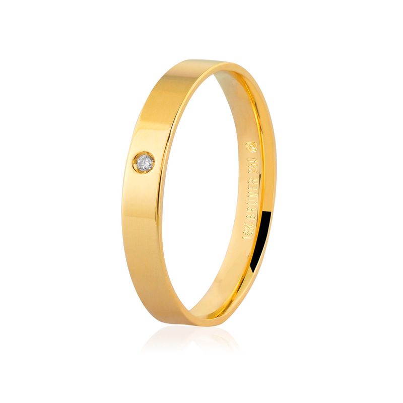 Esta aliança apresenta um design minimalista e atemporal, caracterizado por um perfil de 3mm em ouro amarelo 18k com acabamento polido de alto brilho. A joia possui uma superfície lisa e contínua, destacando a pureza do metal nobre. O ponto focal da peça é a cravação delicada de 1 pedra de diamante (brilhante) que soma 0.9 pontos, posicionada centralmente no aro para oferecer um brilho discreto e elegante. Seu formato interno anatômico garante um conforto superior, proporcionando um ajuste suave e perfeito ao dedo para o uso diário.