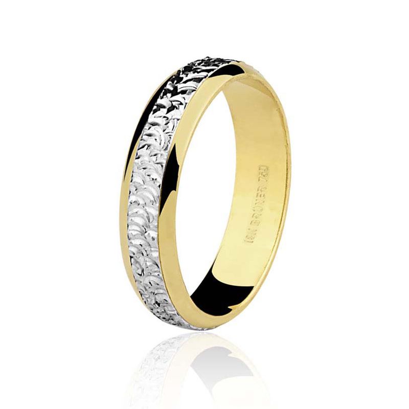Perfeita para casais que buscam uma joia de 5mm que simbolize a maturidade de uma união, combinando o brilho artístico do acabamento diamantado com a elegância da composição bicolor.