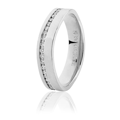 Perfeita para quem busca uma joia de 4mm que une a modernidade do ouro branco ao impacto visual de uma trilha completa de diamantes laterais.