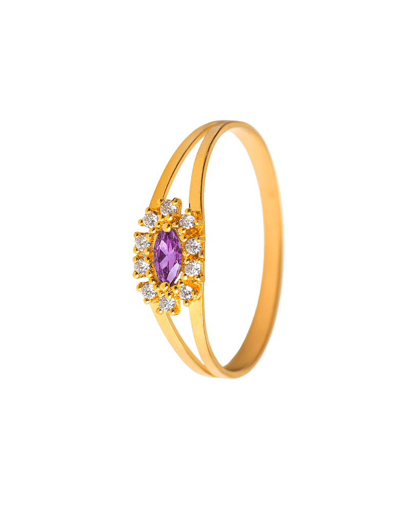 Este modelo apresenta um design clássico e sofisticado, com uma estrutura vazada que realça a delicadeza da joia. Confeccionado em ouro amarelo 18k, o anel possui um aro que se divide em dois filamentos finos e elegantes ao se aproximar da coroa central.