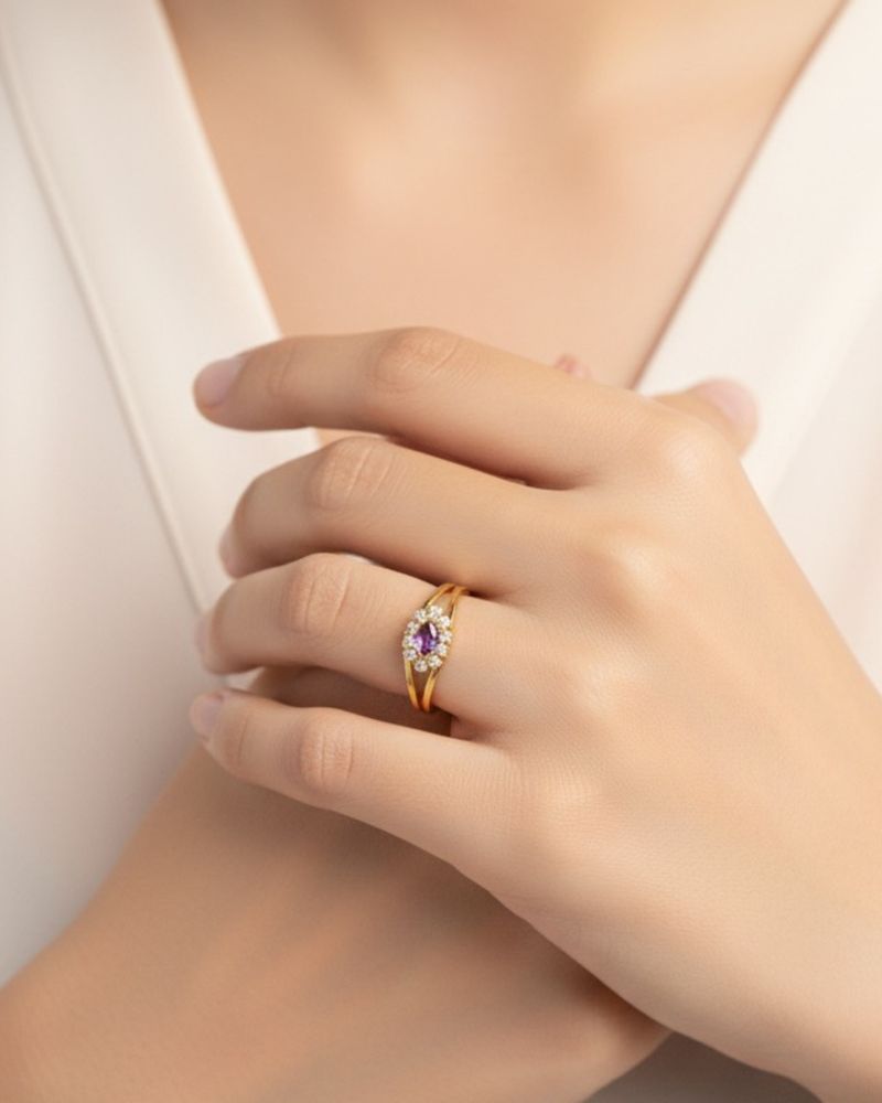 Estrutura do Aro: O design de aro duplo vazado proporciona leveza visual e conforto, mantendo o foco totalmente na composição central de pedras.
