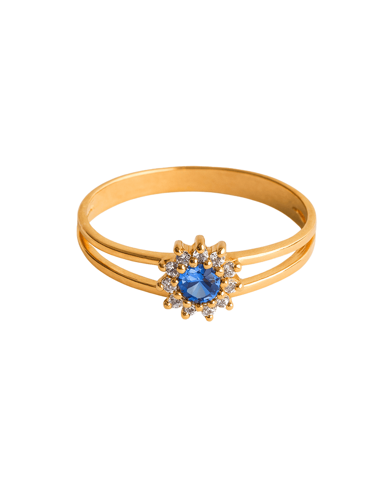 Este modelo apresenta um design clássico e equilibrado, destacando-se pela elegância de sua coroa em formato floral. Confeccionado em ouro amarelo 18k, o anel possui um aro vazado que se divide em dois filamentos finos e simétricos ao se aproximar da gema central.