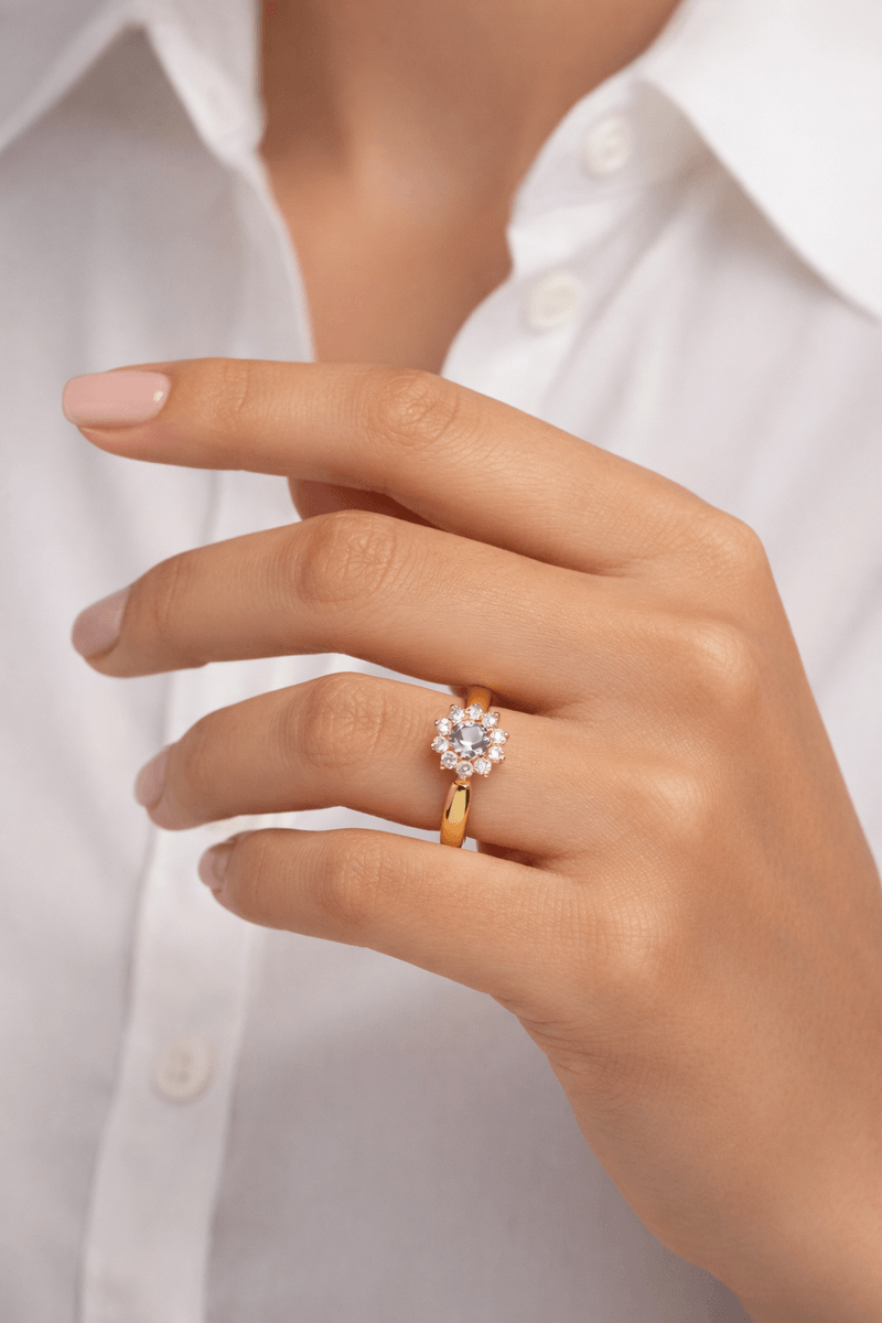 A joia ostenta uma pedra central em formato redondo com 3.00 mm de diâmetro, posicionada no ponto de encontro das hastes do aro para destacar a cor da graduação. Para enriquecer o visual, o modelo conta com 2 pedras incolores de 1.00 ponto cada, inseridas de forma precisa no design para adicionar pontos de brilho que acompanham o movimento do ouro.