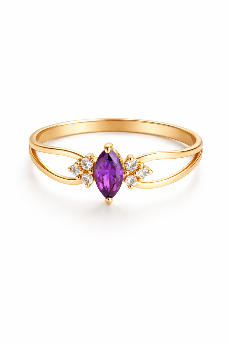 Este modelo apresenta um design fluido e delicado, caracterizado por um aro vazado que se divide em curvas suaves ao se aproximar da gema central. Confeccionado em ouro amarelo 18k, o anel transmite leveza e elegância em cada detalhe.