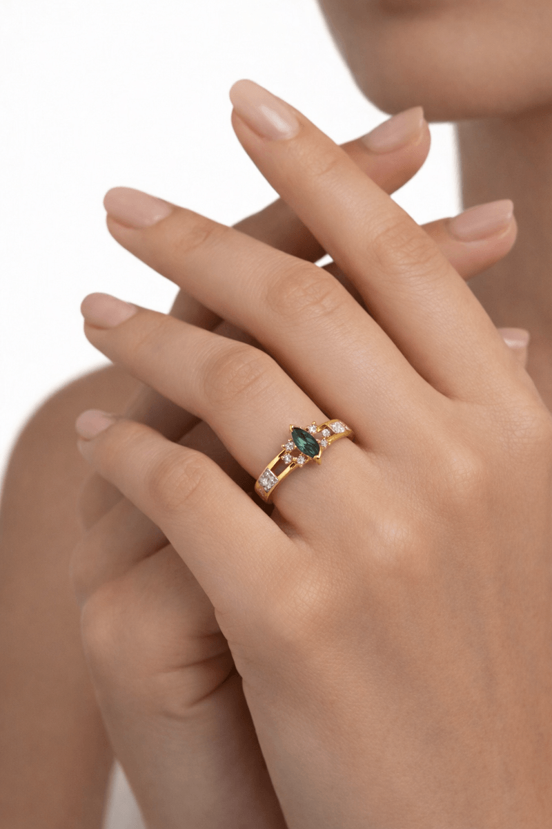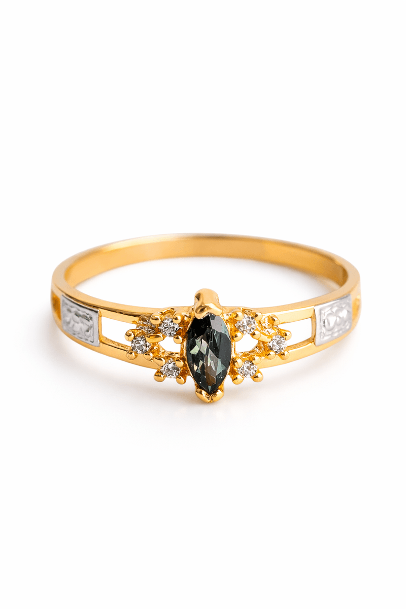 A peça central apresenta uma pedra em formato redondo com 4.00 mm de diâmetro, que se torna o foco visual com a cor representativa da carreira. O grande diferencial deste design é a sua composição de pedras incolores: são 14 pedras de 1.25 pontos cada, totalizando 17.5 pontos. Estas gemas estão distribuídas de forma a criar um contorno luminoso ao redor da gema central e a adornar as laterais do aro, conferindo um acabamento luxuoso e uma radiância única à joia.