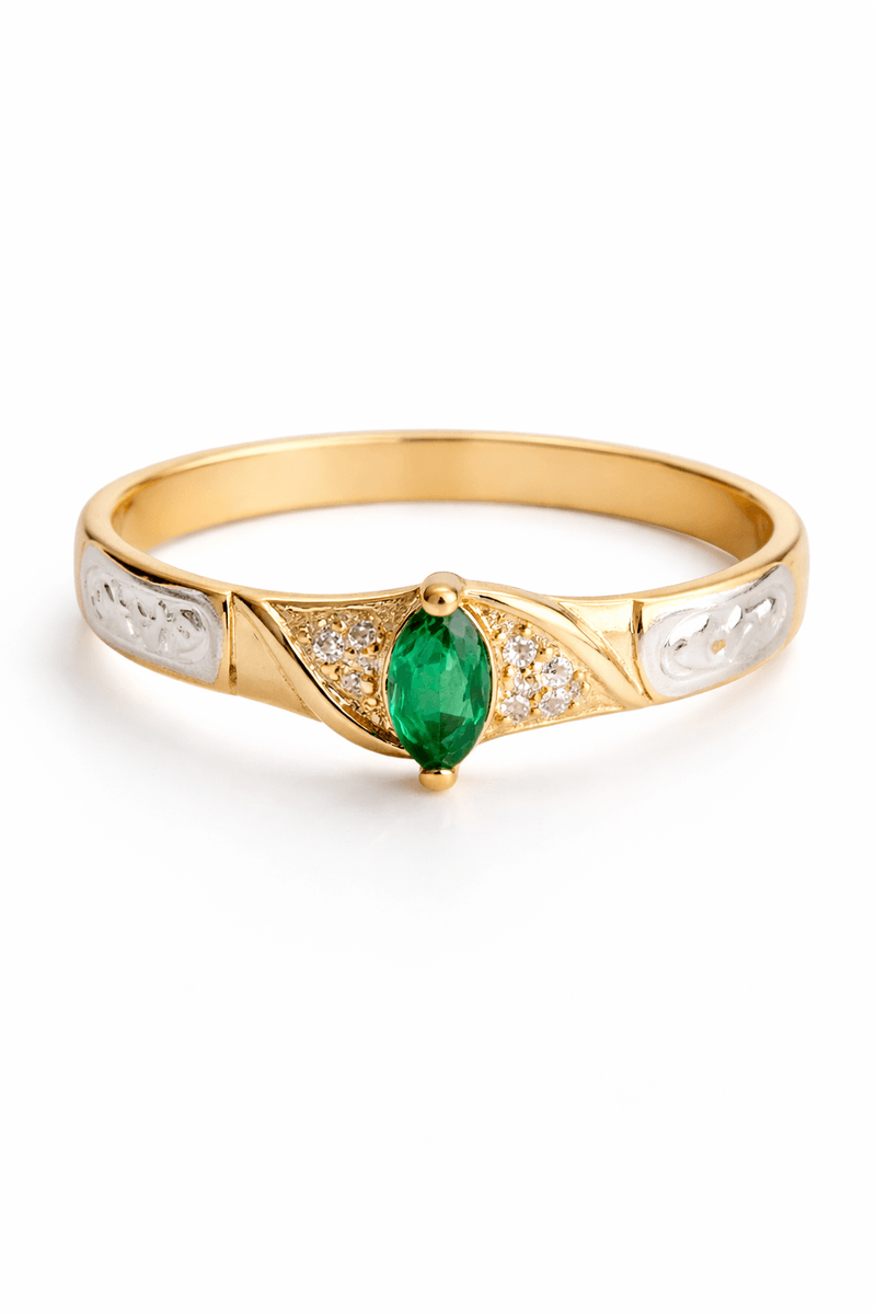 Pontos de Luz: Adornando a curvatura do ouro que abraça a gema principal, o anel conta com pedras incolores estrategicamente posicionadas. Esses detalhes adicionam luminosidade e realçam o contraste com o metal polido.