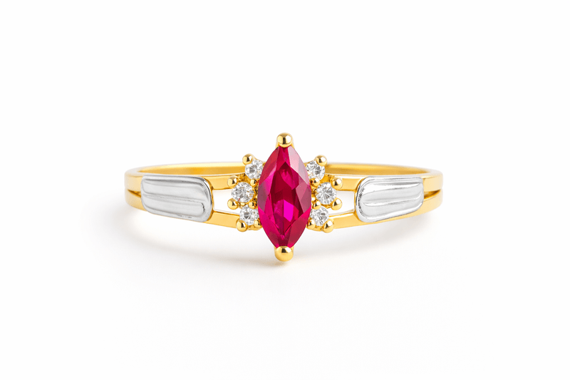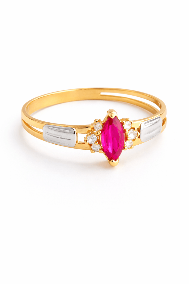 A joia possui uma pedra central em formato redondo com 3.00 mm de diâmetro, que se torna o ponto focal da peça com a cor representativa da graduação. O brilho é intensificado pela presença de 2 pedras incolores de 1.00 ponto cada, posicionadas de forma estratégica no design do aro. Esses pontos de luz acompanham a curvatura do ouro, conferindo um acabamento refinado e um brilho sutil à composição.
