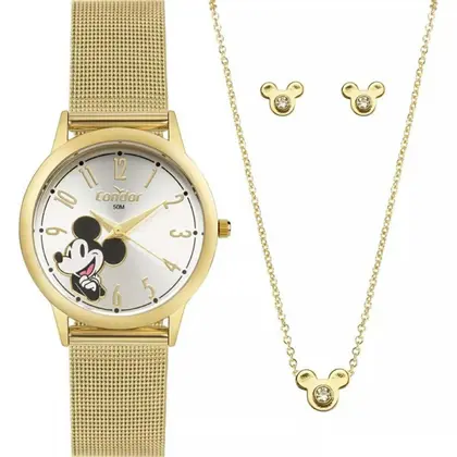 O Kit Relógio Condor Disney Mickey CO2035NGU Dourado é o presente perfeito para celebrar a magia da Disney! Este conjunto é um verdadeiro mimo, unindo a funcionalidade de um relógio elegante com o charme de duas semijoias exclusivas, todas inspiradas no ícone mais amado do mundo: o Mickey Mouse.