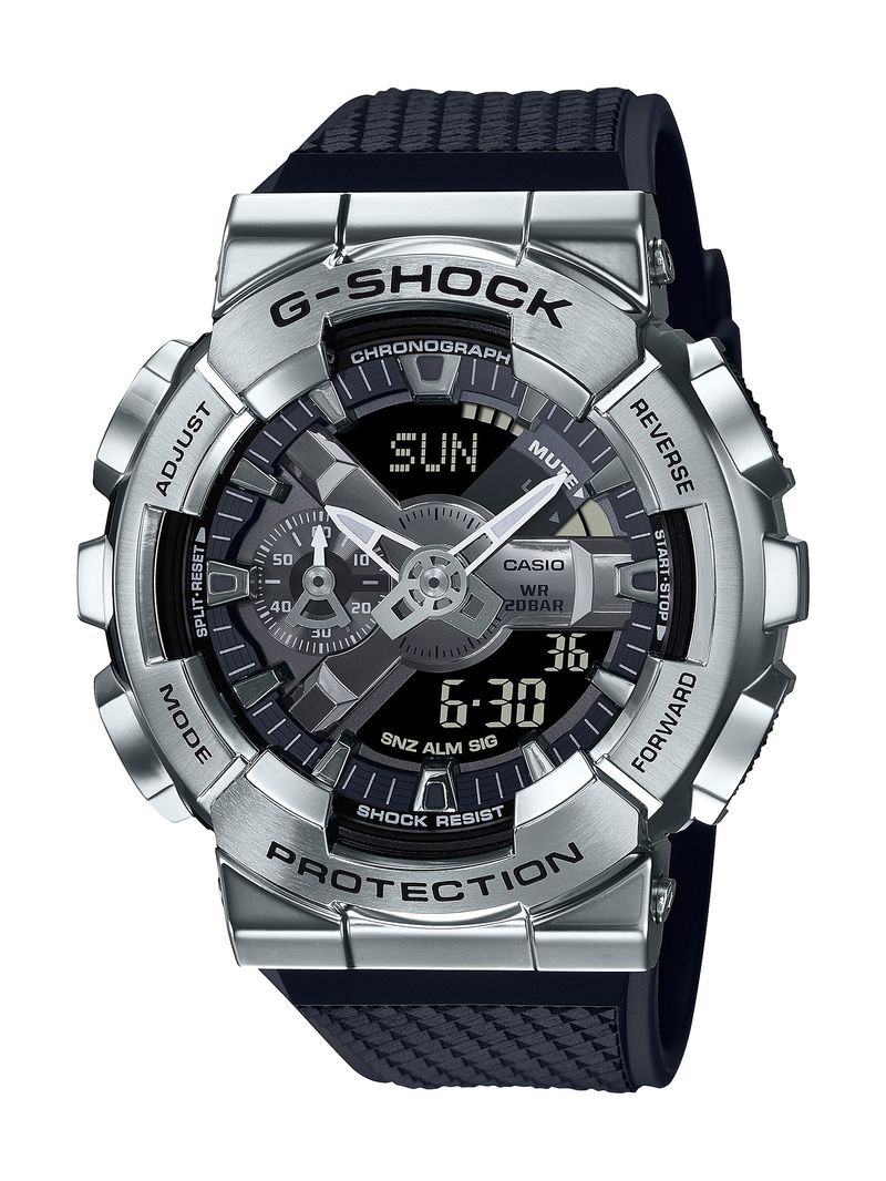 Do G-SHOCK, os relógios resistentes que estão sempre evoluindo em uma busca interminável pela resistência, a série GM-110 é baseada na combinação de monitor analógico-digital do modelo GA-110 da rígida e moderna linha revestida de metal com molduras de aço inoxidável. O mostrador tem uma peça em forma de Y característica que mantém a textura do metal, e o mostrador digital e os ponteiros de hora e minuto são dispostos de maneira bem equilibrada para melhorar a visibilidade.