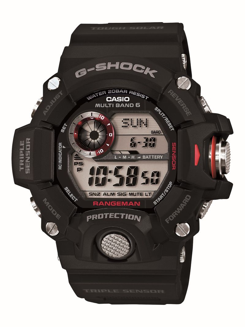 Apresentamos o RANGEMAN, o mais novo membro da série Master of G: um relógio robusto e resistente projetado e desenvolvido para se destacar na maioria das mais desafiadoras condições imagináveis. O RANGEMAN vem equipado com Sensor Triplo, para que você desfrute de leituras de altitude, pressão barométrica, temperatura e direção na palma de sua mão. Botões cilíndricos proporcionam uma excelente operação e resistência a impactos aprimorada. O botão do sensor, utilizado com frequência (centro à direita), vem com uma tampa de metal que o protege contra colisões laterais e sujeiras. Pressione o botão do sensor em qualquer modo para acessar diretamente tela do sensor. Cada modo de sensor tem o seu próprio sinal sonoro, o que significa que você pode saber qual modo está acessando mesmo sem olhar para o relógio. Tudo isso, além do registro de tempo com um toque, medição de tempo percorrido com um toque, a força e a durabilidade do G-SHOCK reconhecidas mundialmente e muito mais tornam o RANGEMAN a escolha perfeita para soldados, equipes de resgate e todos aqueles cuja profissão ou atividade de lazer demande confiança total.