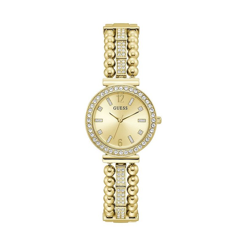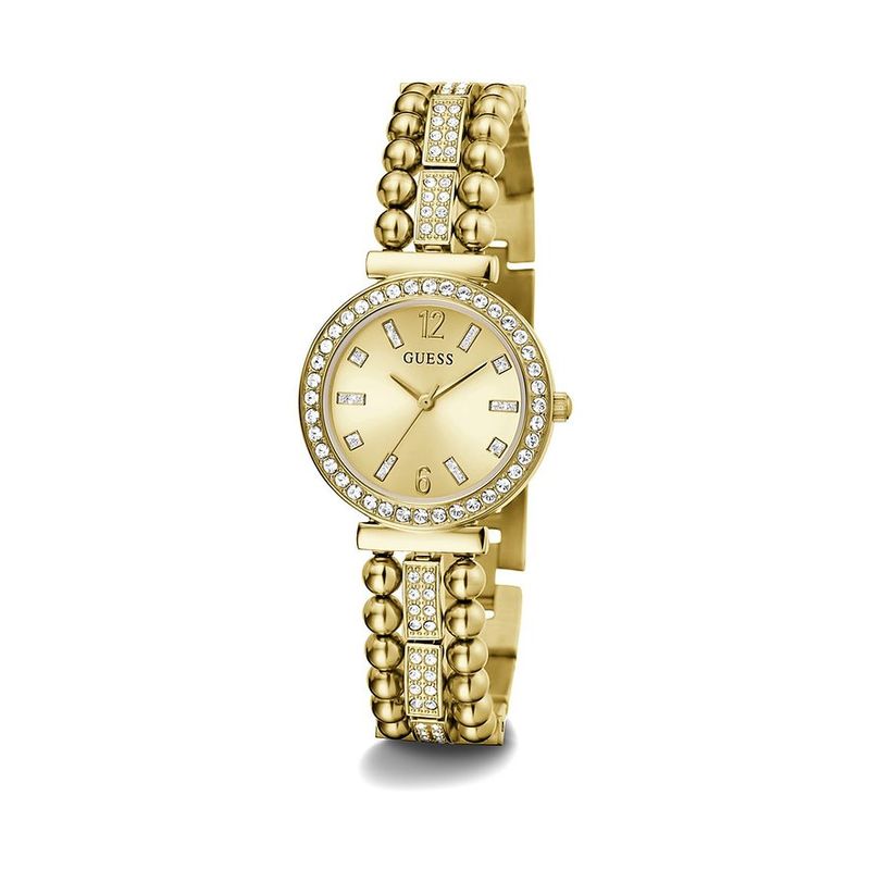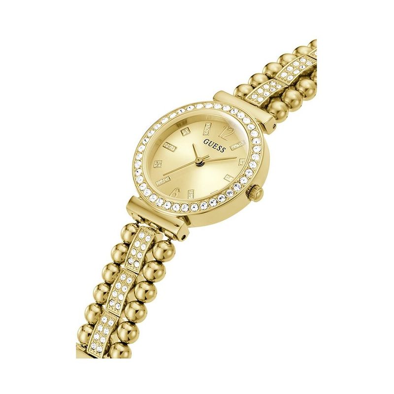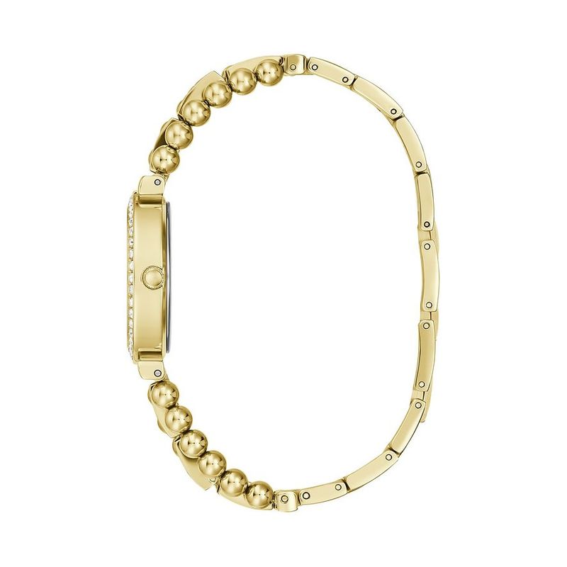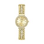 Caixa e Mostrador: A caixa compacta de 30mm e o mostrador em tom Champanhe (Dourado) mantêm a harmonia total com o acabamento full gold, realçando os marcadores e ponteiros.