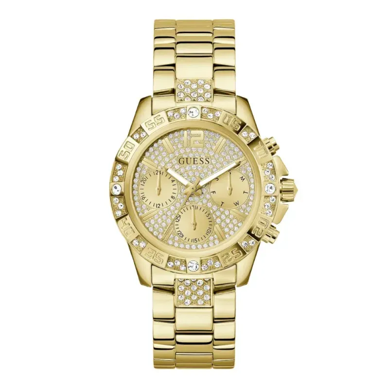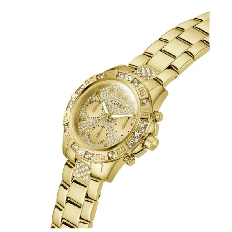 O Relógio Guess GW0771-L2 é a expressão máxima de glamour e sofisticação. Totalmente Dourado, esta peça é um acessório de joalheria, apresentando uma pulseira estilo bracelete/corrente robusta e elegante. A caixa redonda é cercada por pedras, e o mostrador é detalhado, com um brilho intenso que se destaca no pulso. Fabricado em Aço Inoxidável de alta qualidade, é o relógio perfeito para eventos, festas e para quem ama grifes. Adquira o seu Guess e brilhe!