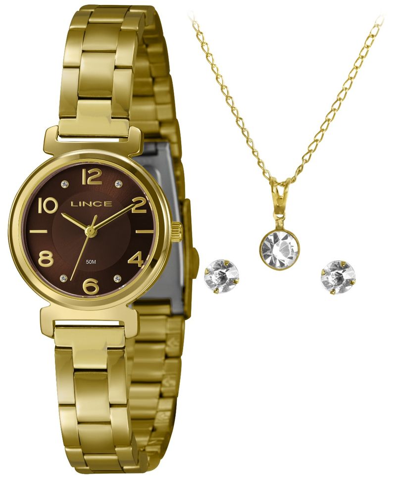 Este é um kit completo que oferece a durabilidade do metal dourado com a sofisticação do mostrador marrom. Ele é a solução ideal para quem busca um visual clássico, elegante e coordenado sem esforço. A combinação de cores é um verdadeiro coringa no guarda-roupa, garantindo que a cliente terá um acessório que usará por anos.