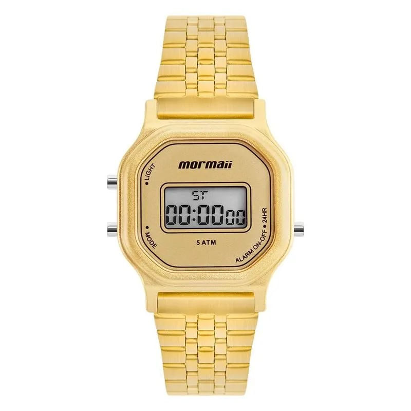 Com pulseira de aço, combina charme vintage com design contemporâneo. Mostrador lcd positivo para fácil leitura, disponível em banho dourado, resistente até 50 metros, oferece funcionalidades como calendário, cronógrafo e luz eletroluminescente. O complemento ideal para um estilo vintage com toque moderno.