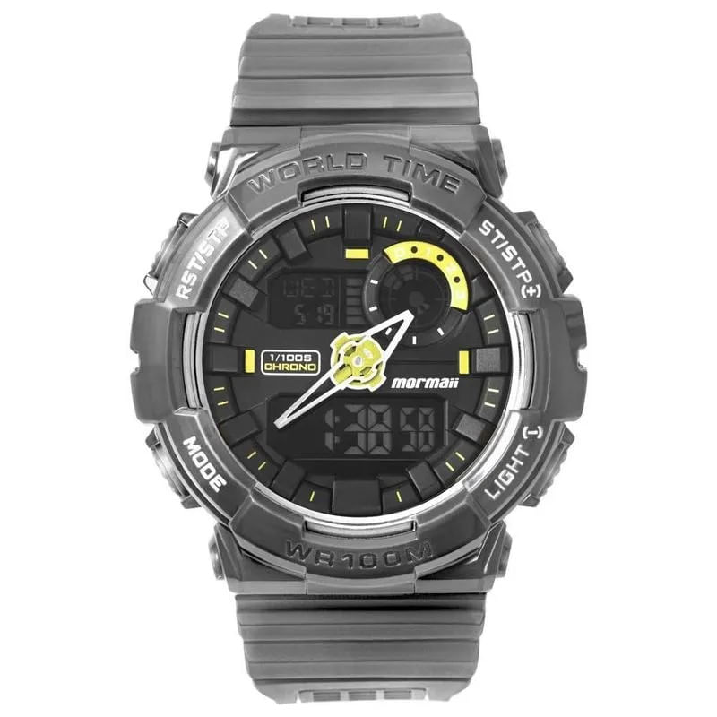 O modelo masculino possui caixa e pulseira fumê transparente, anadigi com módulo digital negativo, resistência à água 10 atm e detalhes em amarelo