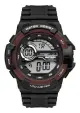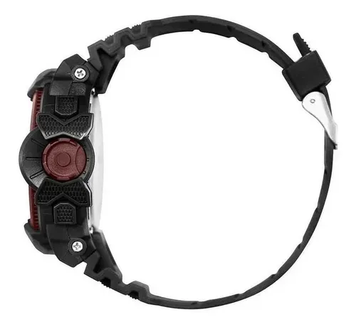 Design Tático e Bicolor: Possui uma caixa grande e robusta em preto com detalhes em vermelho-escuro ou bordô ao redor do mostrador. A pulseira é feita em borracha ou silicone preto.